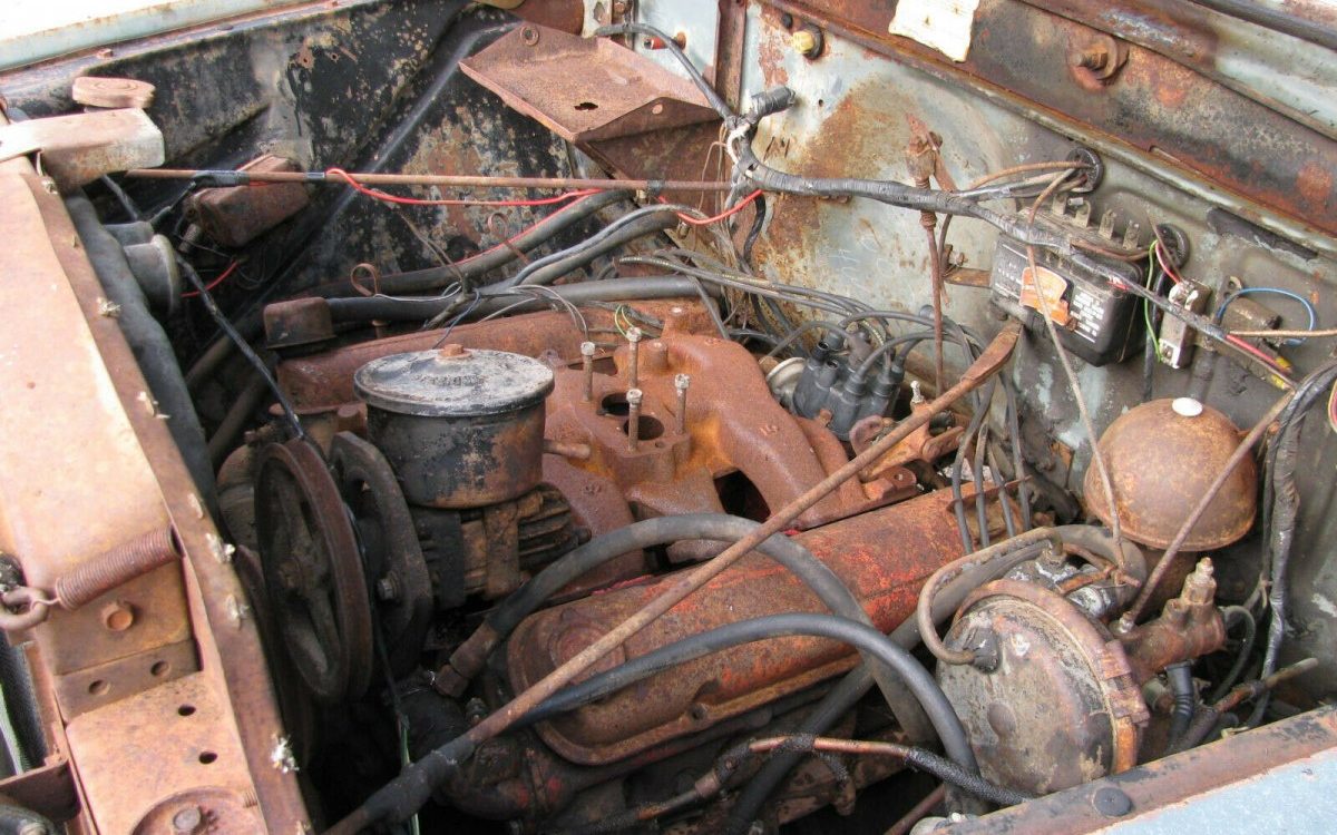 The engine is a 316 cubic inch V8. Unfortunately, it was partially disassembled some years ago and there are parts missing. You can see the carburetor is gone along with the thermostat housing. The seller does have a running 389 from a 1959 Pontiac that goes along with the sale. If this was my project, I’d probably put a big V8 or modern diesel in it. How about you?