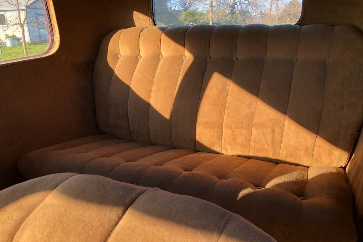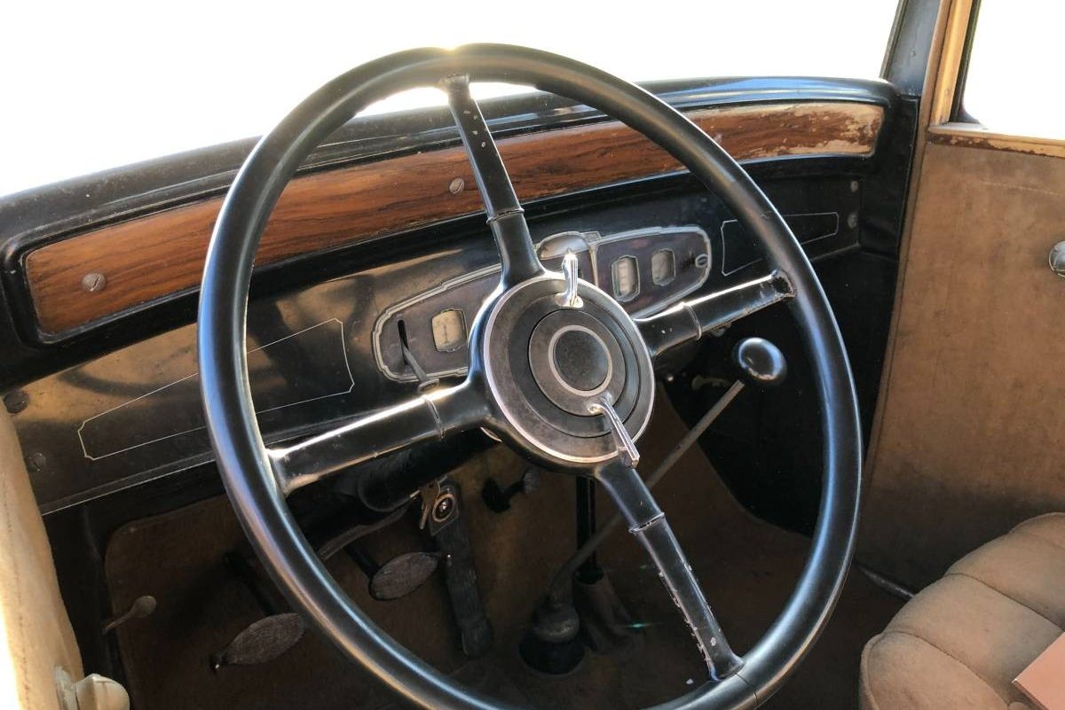 This car’s condition is solidly in the good category. The body has peeling paint and spots of wear, but no dents that I can see. The seller did not really clean up the car either, so the dust might be hiding some other small imperfections but the car looks solid. The chrome is worn but presentable and for a survivor car, it is fine. The interior is in amazing condition. The upholstery looks so good that it is hard to believe it is 90 years old, though it could be possible. The seller states the odometer is broken so there’s no visible clue how many miles this car has. The other gauges look serviceable if a bit dirty, they might benefit from a cleaning. The faux wood above the dashboard is in nice condition, with the painted woodgrain mostly intact.