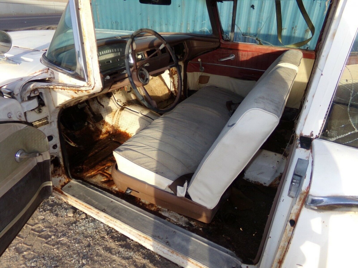 Even though this wagon is more than 60 years old, it’s still wearing most of its original paint. The right-side door has been replaced, explaining the differences in color and the seller thinks the right front fender also might not be original to the car either. There is rust brewing in the driver’s side rocker panel and door bottom and a few dents and dings are present in the sheet metal and chrome pieces. Rust is also present on the floor pans and it may go deeper than surface corrosion. If you try to raise the window in the tailgate, you’ll find that it’s missing (the glass, that is, not the gate).
