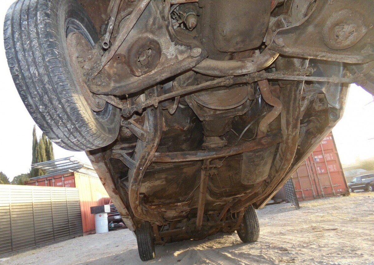 Looks like someone used a bucket loader to lift it for the underneath shot, wonder if the doors still close or open after the stress, two door makes it worth a full restore, keep the six, dual carbs and a header, mod the air cleaner for two carbs.