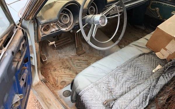 The interior of this Polara is pretty shot. The dash is cracked, the driver’s seat is down to the springs, the carpet is gone (you can get a good look at the floor) and the door cards are missing or trashed. The instrument panel looks intact but no word if any of it is operable. As has been the case recently, there is the required (I guess by law?) box of “something” positioned on the front passenger seat.