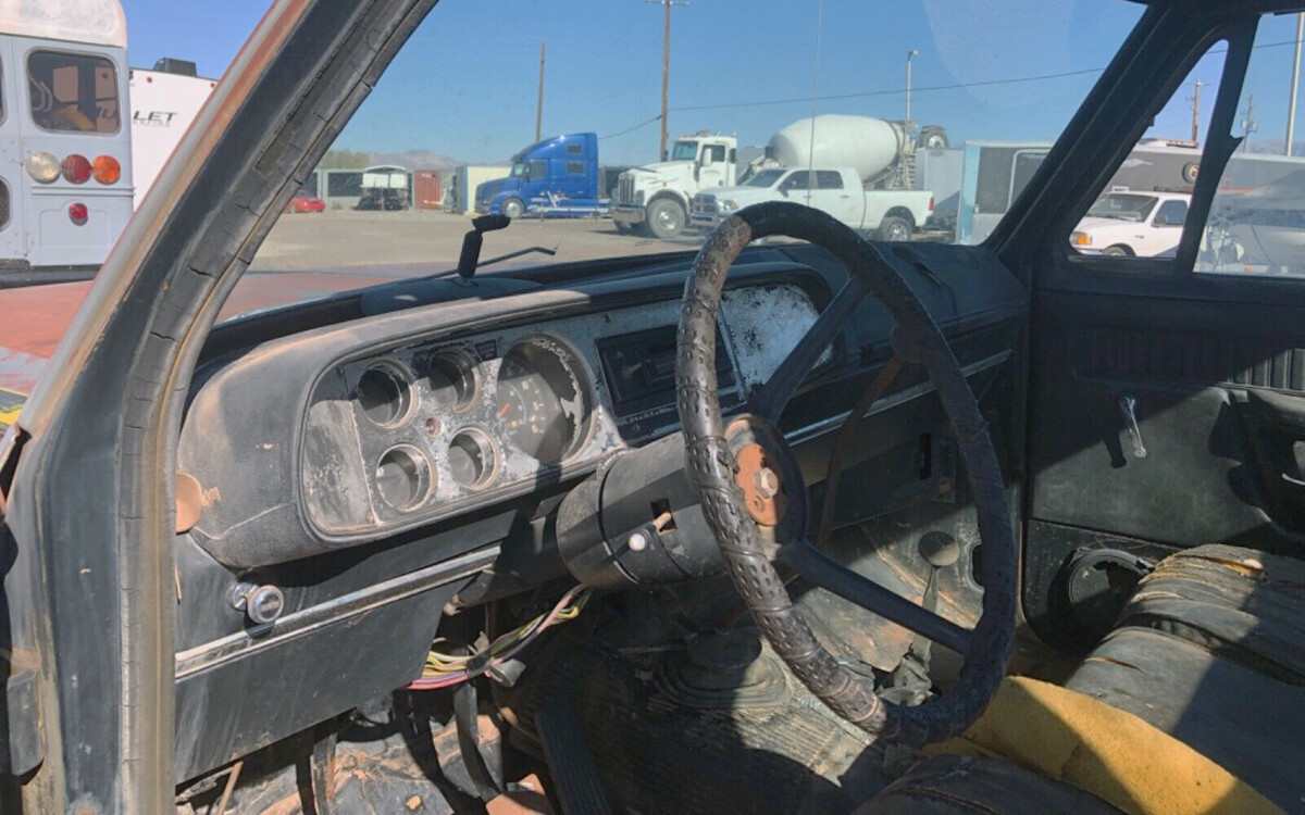The interior is as fried as you would be if you would have been sitting in the Arizona desert for years. Some of it is salvageable, of course, but just plan on spending some scary money inside, after spending a similar amount on the exterior. That’s not even talking about any potential rodent damage to wiring and anything else. The seats are basically gone, but hopefully enough of them are left that they can be used as patterns. Inside the short box looks solid and faded. As rough as this one looks, it would be a fun project. This truck has a four-speed manual transmission, which is pretty cool. It seems like most of them are automatics.