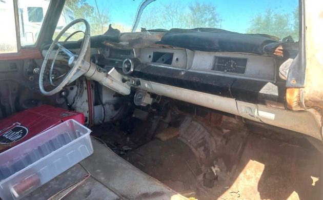 The 364 cubic inch “Fireball” V8 (if the original 250 hp engine is the one we see) has a cracked block, so a partial or total replacement will be needed. The seller indicated he would keep the car and put a Ford Crown Vic chassis under the machine if it didn’t sell quickly. We wonder if he ever did that (and why).