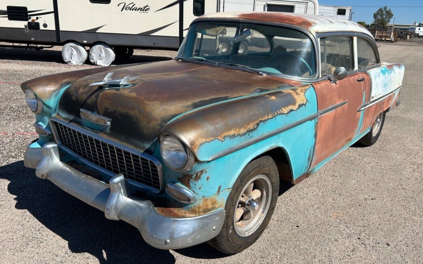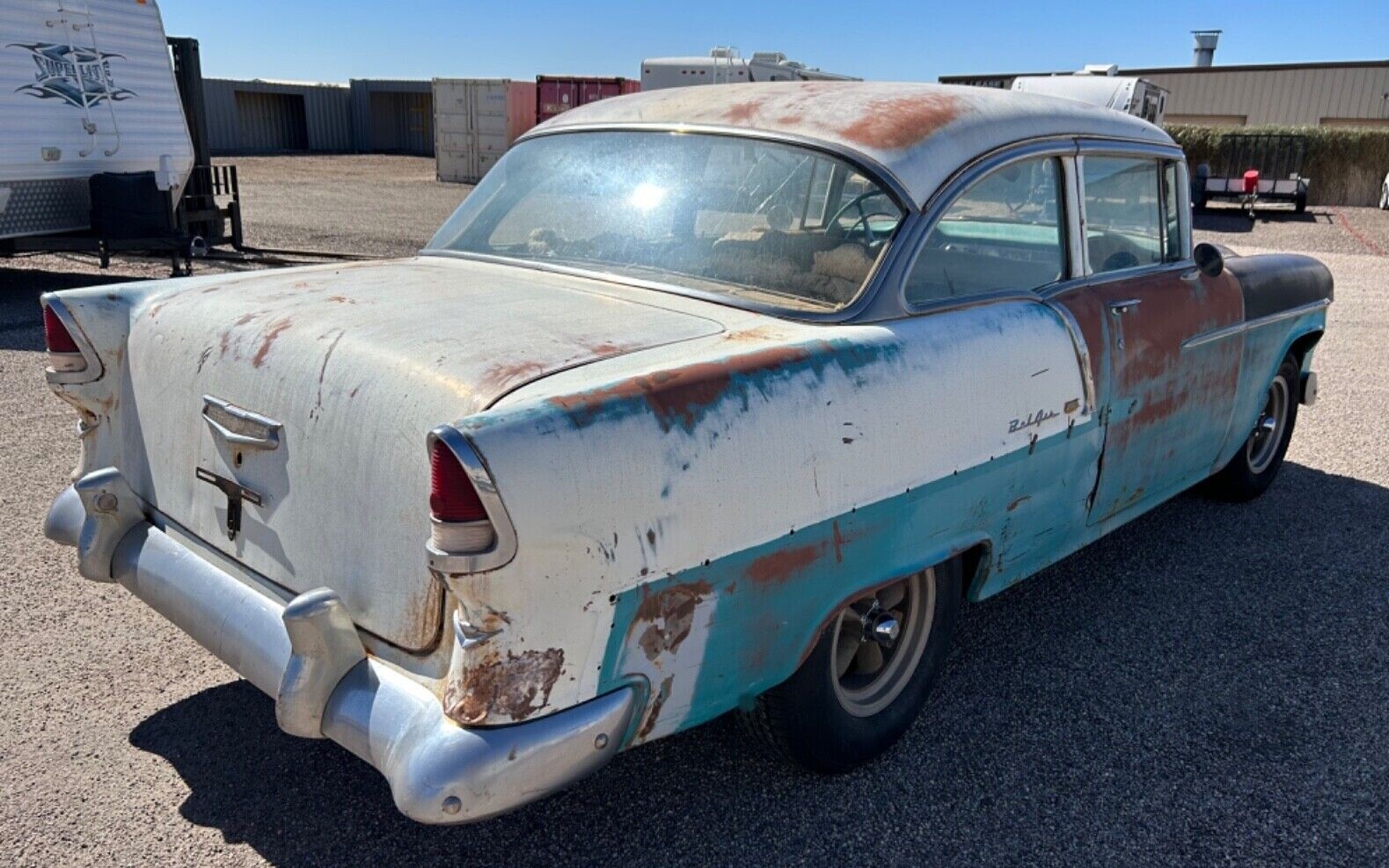 The seller confirms his tri-five has recently been rescued from the confines of the Arizona desert, with one of those southwest-style bodies that require years of baking in the sun to get to how we’re seeing it now. While there’s plenty of top layer rust visible, the owner tells us that overall the body itself is in very nice shape with only a few areas of rust that actually go below the surface, but one issue to be aware of is in the quarters as a previous owner flared them out to fit a larger set of tires. He assures us the panels haven’t been damaged or cut, just know some sheet metal massaging will be needed here to return the steel to its original depth.