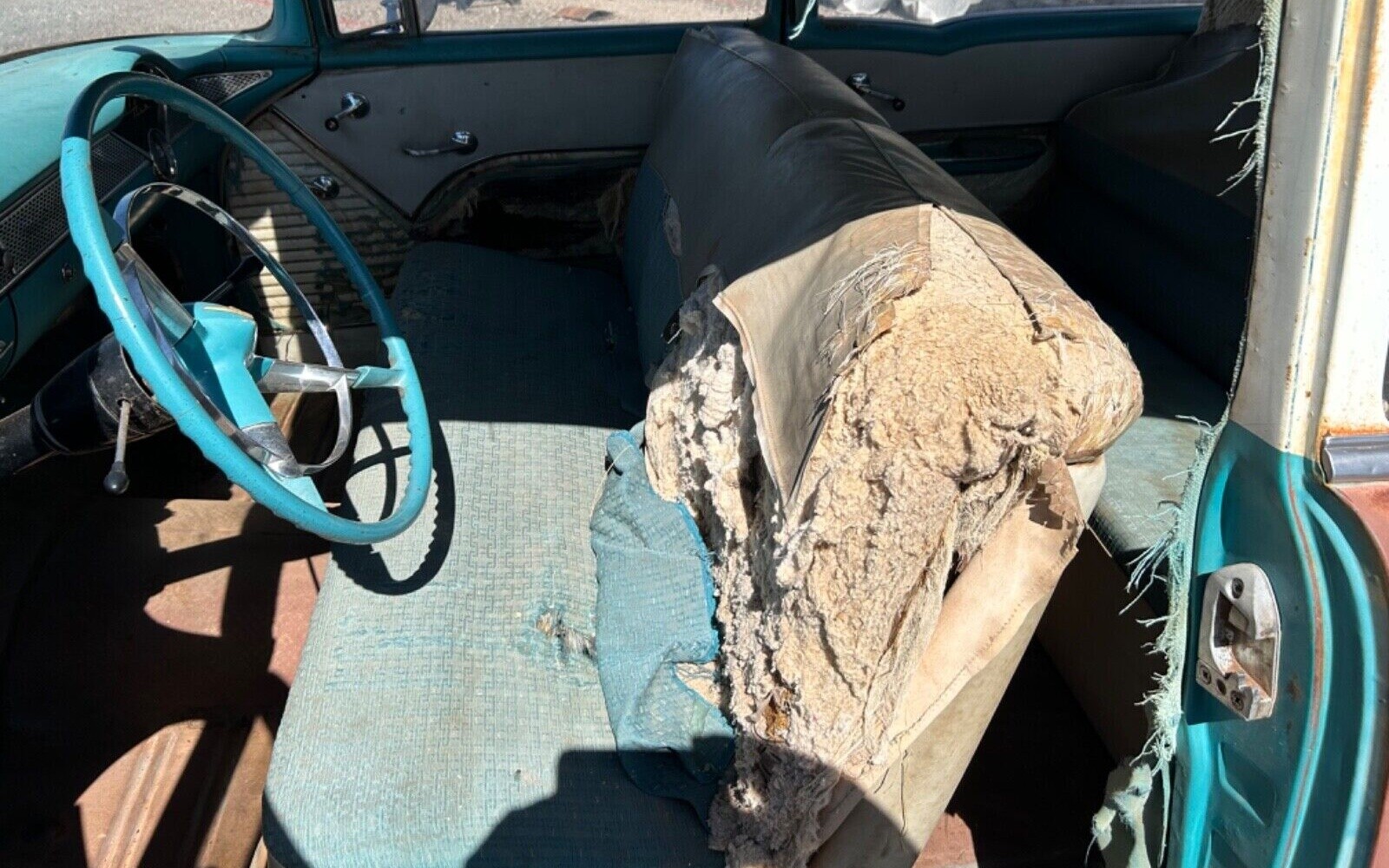 Most of the inside is going to require attention, with both seats reflecting an oven-baked appearance from their past environment, but I was surprised to see how well the dash and instruments seem to have held up. Granted, they’re not perfect, but I’m guessing there will be several salvageable items from this part of the interior. Unfortunately, the headliner is toast, and there’s not a lot of hope for the door panels either.