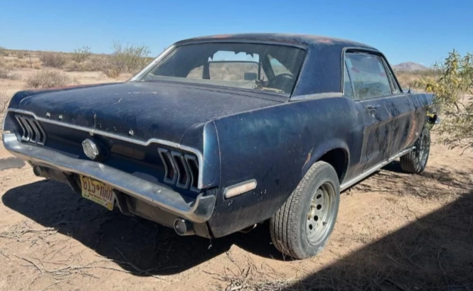 The body on this project car may be mostly okay since it’s spent a lot of time out in the New Mexico desert. The paint may be dark blue, and the interior cream colored. Mustang sales softened a bit to 317,000 units in ’68, but competition was coming at Ford from all angles, with the Chevy Camaro leading the charge.
