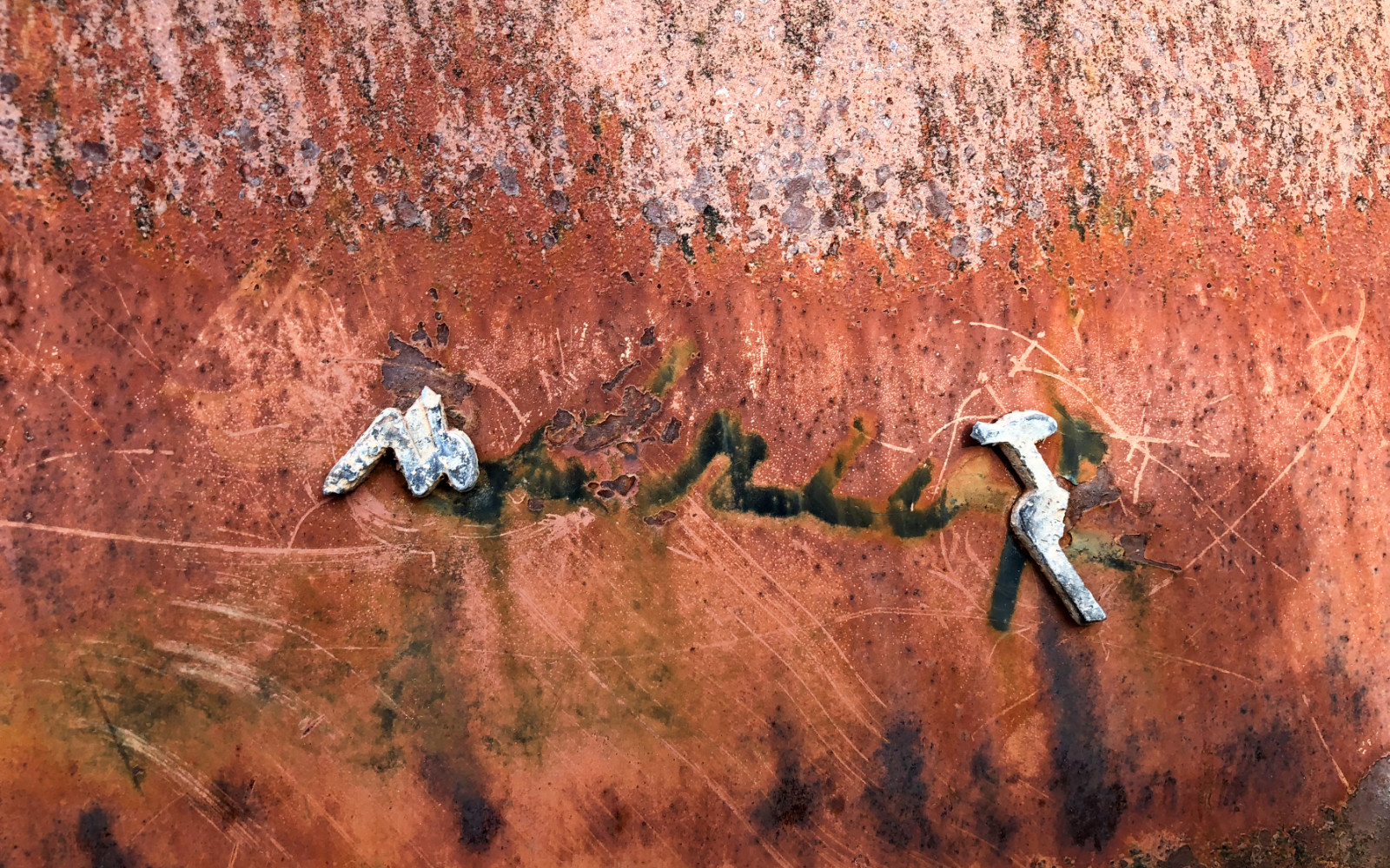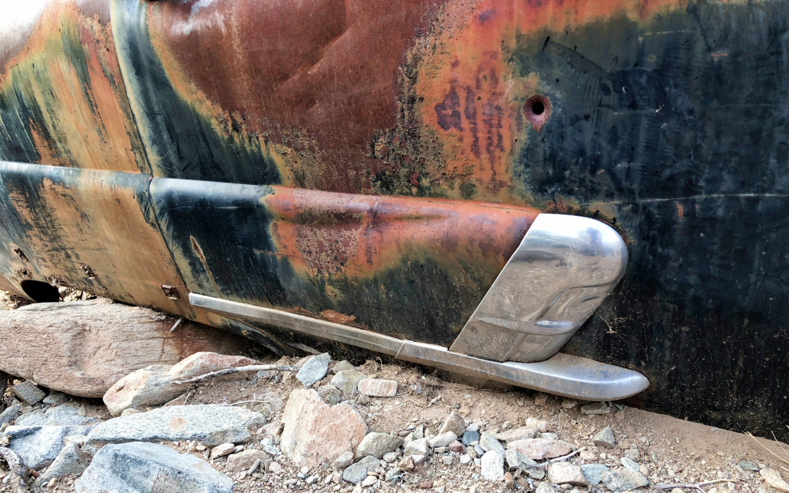 It looked like it had been driven through the desert decades ago and gotten stuck in the wash. It has a wonderful patina from the desert sun. The chrome is in far better shape than the rest of the car. As a car person I can tell most makes and models of automobiles but I am at a loss here. Although it looks like 1950’s American made. Hopefully, someone out there can tell me what this car is.
