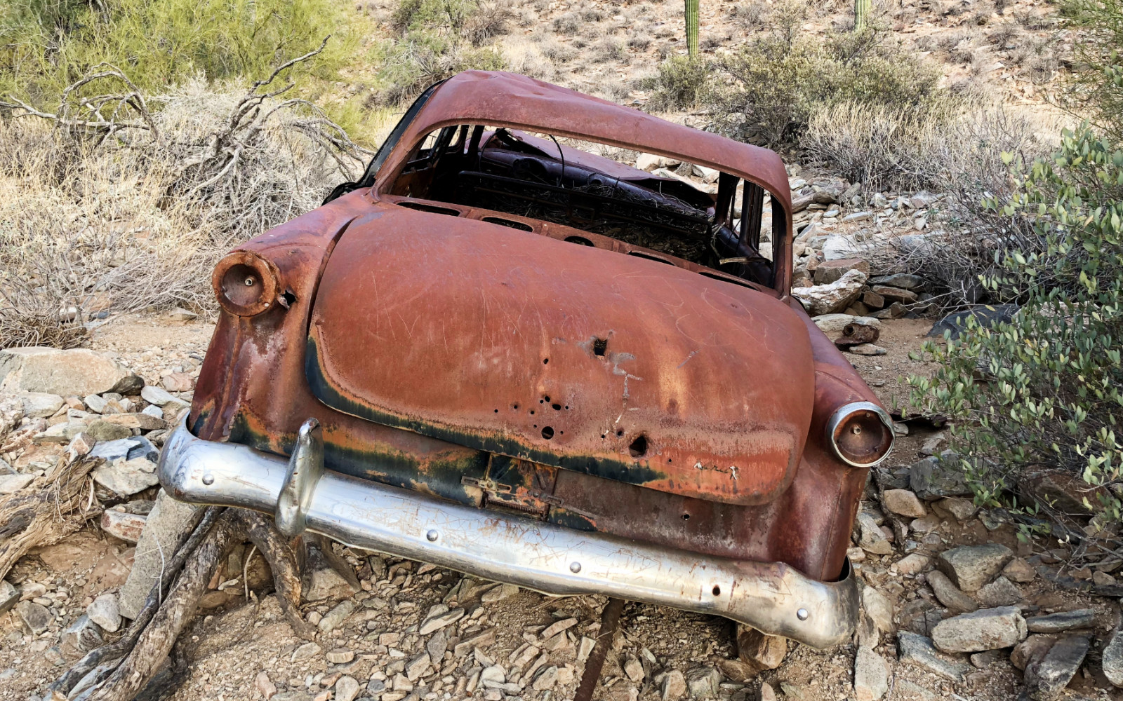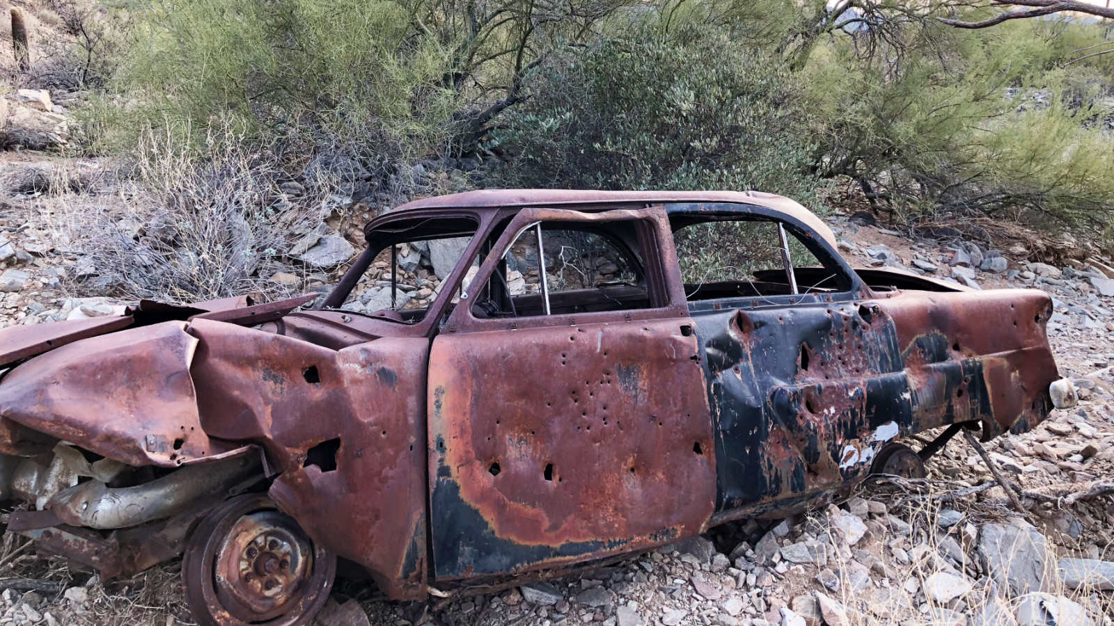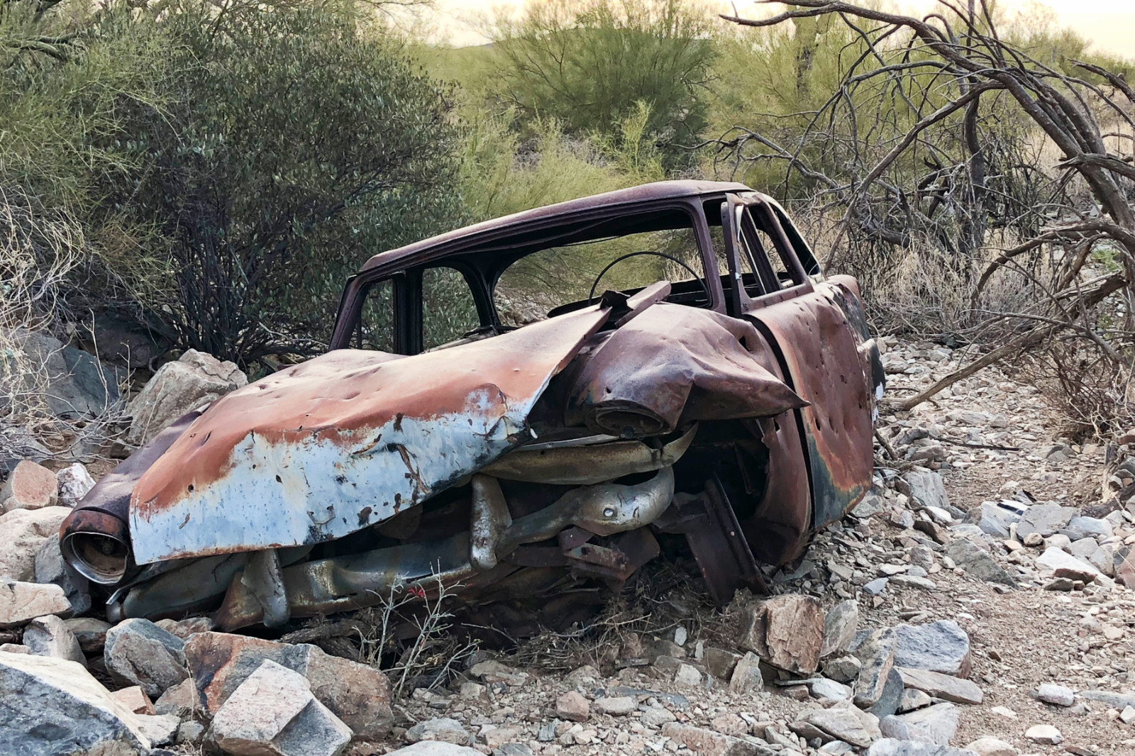 I’ve seen many, many cars like this in the deserts, mountains, and washes of AZ myself in the past 40 years. A lot of them have disappeared in the last 15-20 years with cleanups, the occasional crazy-high scrap steel prices, etc. but there are still some out there. In years past they were sometimes used/buried along the sides of creek beds to control erosion.