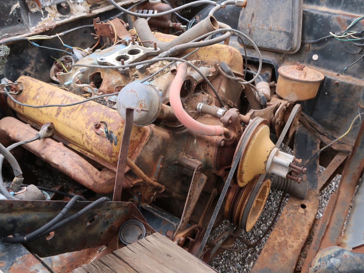 Looks like it’s been a year or two since the engine ran. Wonder what happened to the original 2 barrel carburetor? At least it’s not one of those engineless vehicles.
