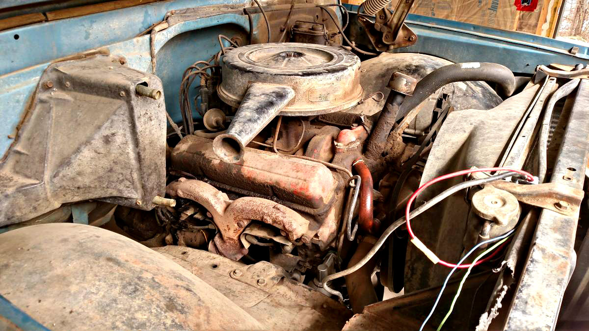 On a funny note, the seller claims that the engine has never been opened up, and from looking at the pictures I can certainly believe that statement. The engine is caked and coated with oil and dirt where if it had been recently serviced it would surely be evident. The 327 V8 is a runner and is mated to a floor mounted 4 speed manual transmission. While this truck does run and drive, I suspect there may be some work involved with making this a reliable driver. The seller did mention that the tires are old and dry rotted, so at a minimum you are looking at a set of tires.