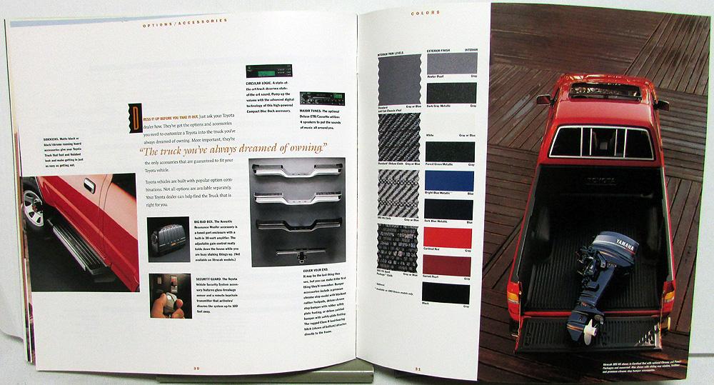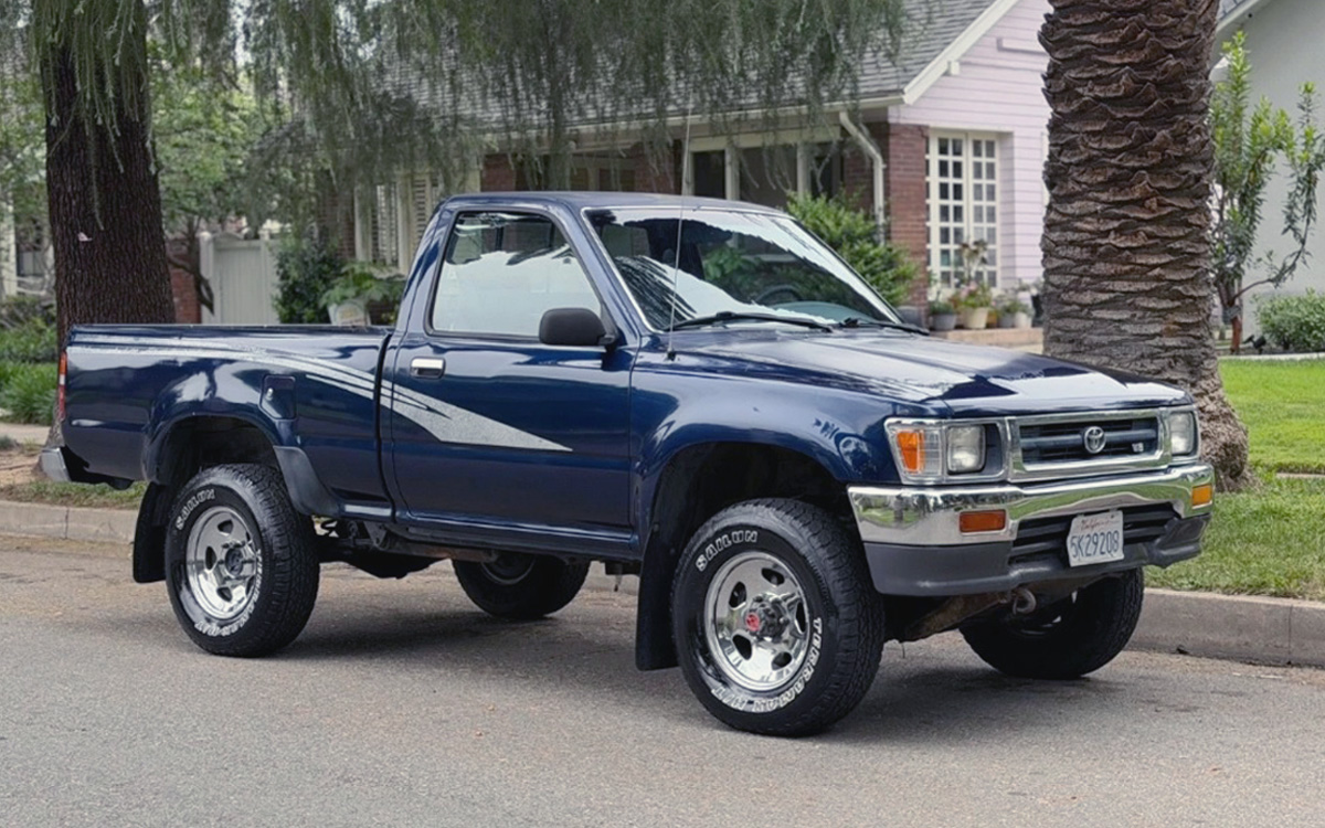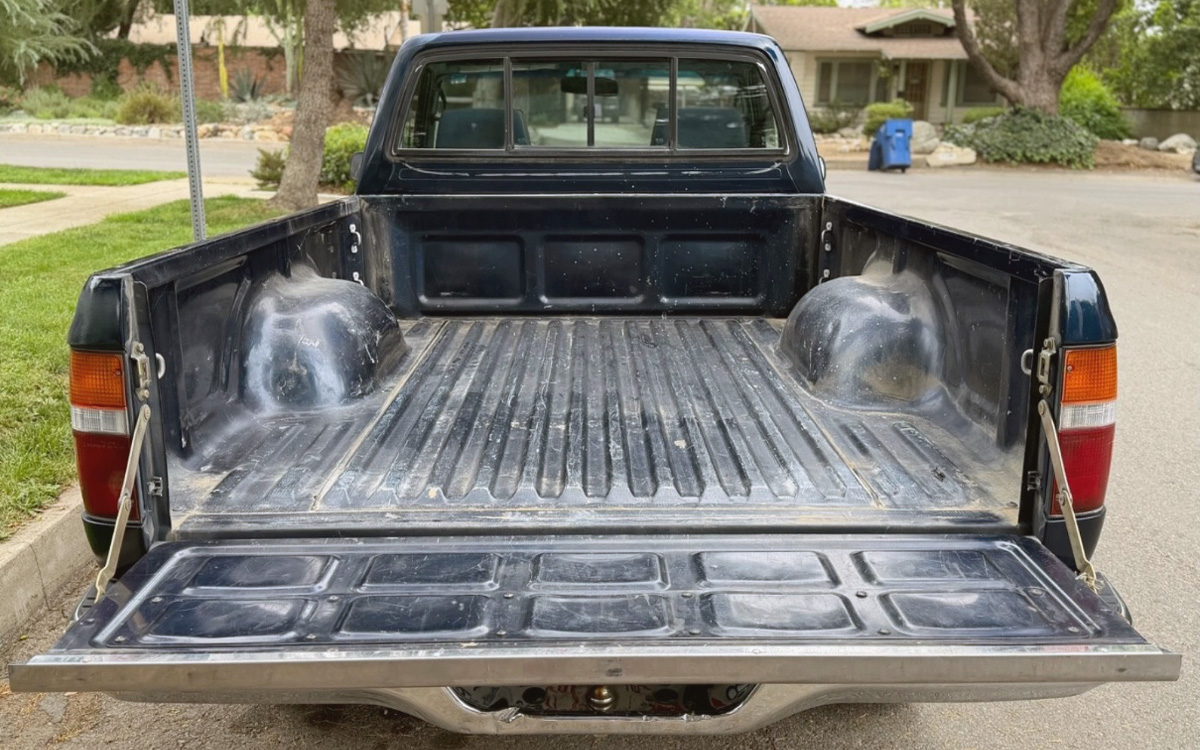 The Ontario heat may have played a part in some rips on the bottom of the driver’s seat, as well as on the vinyl on the side. The dash looks basically like new, so that’s great news. Even better news, this truck has a 5-speed manual! As a regular cab with a short bed, this is probably the look most buyers want. It gives these trucks an almost toy-like look, especially with their jacked-up stance. Having 134,367 miles, this truck has been around the block a time or two, and the bed looks faded, but not like it’s been used for a lot of rugged hauling duties. This truck looks black to me in some of the photos, but it’s what Toyota called “Bright Blue Metallic,” at least in this brochure page. Another source says “Dark Blue.”