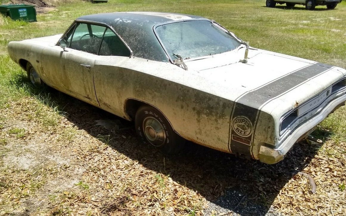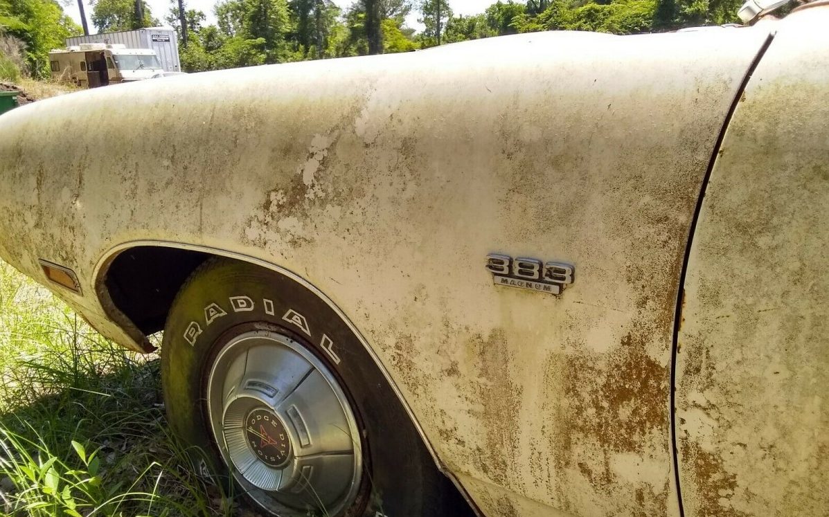 First up, the VIN checks out, this Dodge Super Bee is exactly that. But the seller is pretty mum regarding this Dodge though he does not hesitate to inform potential buyers that this is “A rapidly appreciating muscle car.” That may be the case existentially, but this example is more of a “rapidly depreciating muscle car” considering its current station in life. He does state that it will need complete restoration, Roger that. He doesn’t add any more color than to say that this example has “typical rust” which could mean anything up to and surpassing the floors falling out. More specific detail would really help with the sale. The exterior of this Dodge actually shows pretty well. The body looks intact and undamaged other than one slight crease in the passenger side fender. It’s difficult, however, to get a good look at the lower portion of the body where the Mopar rust option always seems to start. It appears that the quarter panels and the trunk lid have some decomposition occurring and the rear bumper is, expectedly, losing its triple chrome plating but there is nothing obvious beyond that. Its exterior condition is rather amazing for an outside car. The finish has completely faded to chalk but not burned through, though the roof has some weirdness occurring. Perhaps it was repainted another color at some point and now that other color is peeling off. The seller does advise that there is no broken glass, good to know. As for the Live Oak coating, it definitely will wash off; hot water, strong soap, and some elbow grease will do the trick. Of particular note are the four, full-size wheel covers. I’m not sure if they are original and specific to this model but they are not the type of wheel treatment one would expect to find on a Super Bee. The thought here is that this Super Bee is in better physical shape than would be expected.