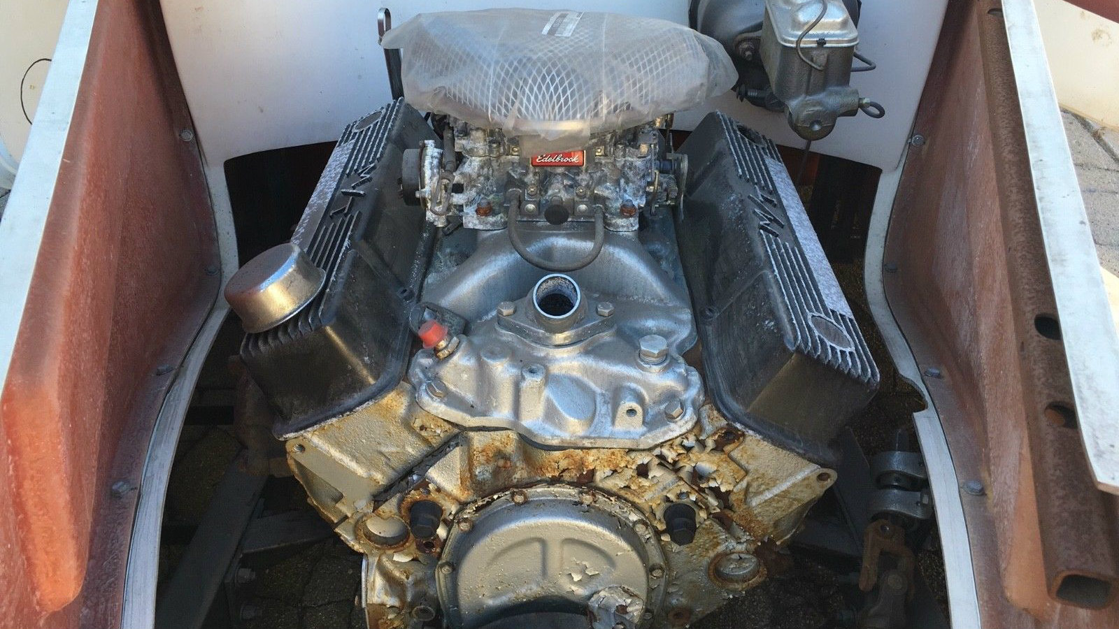 The seller believes this is a 305 or 350 small block Chevy. The deterioration of the paint in the front has me worried about the paint prep or storage, however there are lots of shiny parts here. It is nice to see the new master cylinder. Underneath the front end is some nice looking Mustang II front suspension, and to be honest from what I can see, most of the work that’s been done so far has been done pretty well. Of course, it’s always difficult to pick up where someone else left off, but it might be fun to try. What do you think about this “never been done” limo?