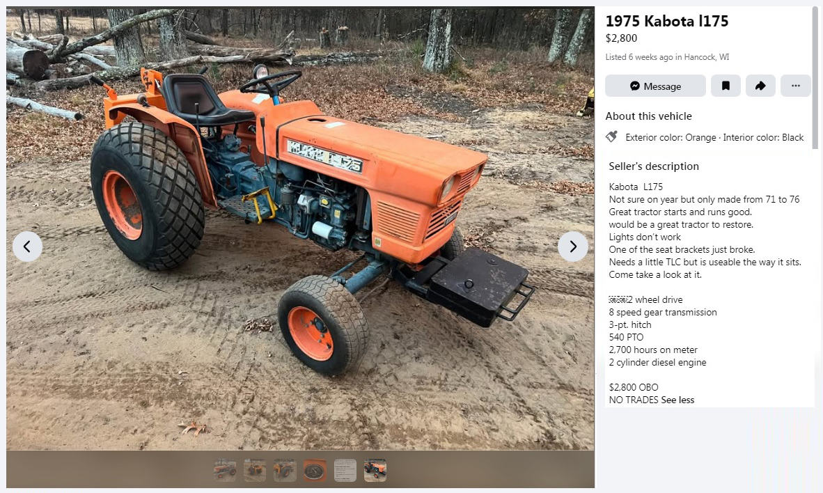 Categorized as a sub-compact utility tractor, this 1970s Kubota L175 diesel tractor is one cool and useful choremaster that would have a million uses for most of us. It’s fun (for me at least) to close out 2025 with another little tractor. This diesel survivor can be found listed here on Facebook Marketplace in Hancock, Wisconsin, and the seller is asking $2,800 or best offer. Here is the original listing, and thanks to Lothar… of the Hill People for the tip!