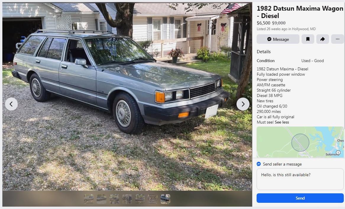 You are probably asking, why am I even bothering to submit my personal opinion on this matter. I turns out I am sitting here with my 11yo grandson (apprentice, tho I am not certified mechanic). For the past 1.5 years we have sat down on Sunday and gone through the week of cars and discussed those that interested him (or me). He liked the look of the Datsun Maxima which reminded him of his other grandma’s Olds ciera wagon (which had a little over 45k on it when she passed). The seats were in pretty darn good shape, she was a tiny lady and it was garage kept in her home in Fredericksburg, VA.