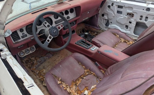 The history of this Trans Am is unclear, with no indication of how long it has occupied its current location. Its tired Cameo White paint is the first issue for the new owner to address, and the overall deterioration will probably motivate them to strip the panels to bare metal and massage the steel as part of their build. I would typically worry about a car that has been left exposed to the elements, especially since this Trans Am lacks the protection of a back window and its T-Top panels. However, the seller states that there is no significant penetrating rust. They claim that the floors and rails are sound, but there is enough surface corrosion to justify a nut-and-bolt approach to prevent future problems. The seller believes they may have a back window that they could include, but they are unsure. We’ve covered the glass and top, but the shopping list will also include light lenses, a grille, and other trim pieces. As we will see, that list will grow as we delve deeper.