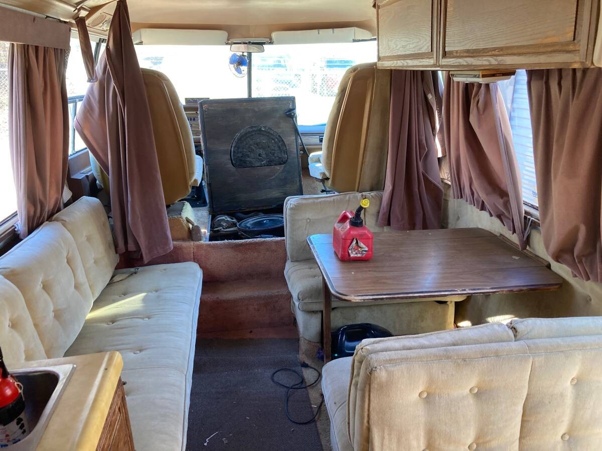 The interior is where you expect to find a factory of horrors when it comes to project-grade motorhomes but this GMC doesn’t look bad at all. The upholstery appears to be fairly clean which is no small feat for a rig with tan seating surfaces. The curtains may have helped prevent a ton of sun damage from entering into the cabin, and the only thing I’d plan to replace immediately is some of that fake wood trim that looks pretty beat up by this point. The GMC retains two air conditioners and what is likely its original Onan generator, but I doubt any of it works.
