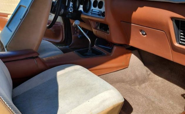 The interior looks a little better than the exterior. The carpet and dash appear to be in good shape except for the missing radio. As can be seen, this is a 4 speed car with a Hurst pistol grip handle. The seats have been recovered or have after market seat covers over them. The seller states the car has 144k miles so since the odometer only goes to 5 digits, they must have knowledge that it only rolled over once. The car appears to be a low option car with no air conditioning, tilt steering, power windows or T-Tops. The console looks to have minor damage.