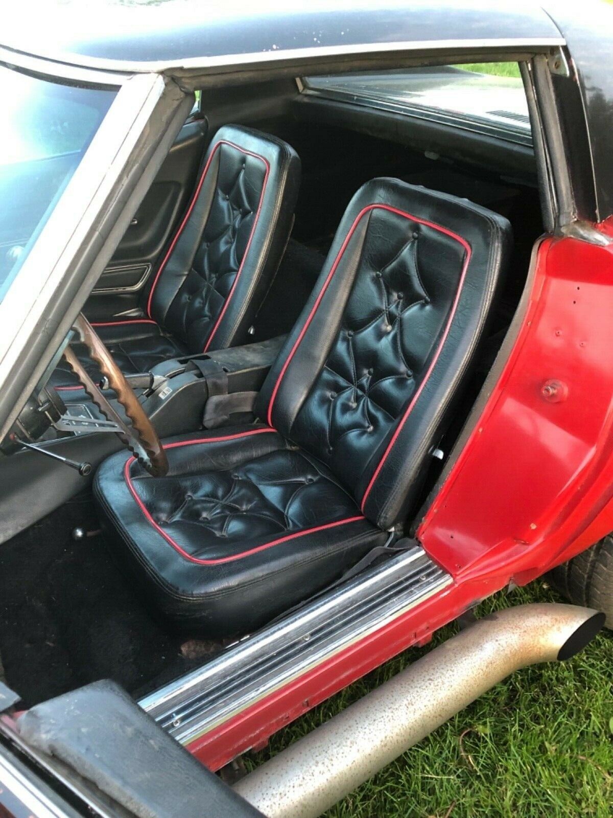 Whoever did the custom paint took it all the way, with the door jambs getting done at the same time and the interior receiving a custom upholstery job with red piping. The seller notes that the original tank sticker is still with the Corvette, as well as the NCRS shipping report, so there’s plenty of documentation to justify investing in a stock color scheme and interior trimmings. Other desirable features include a rare telescopic steering column, and the seller notes the original TI distributor remains in place. If you zoom out of this picture, you’ll see massive side-exit exhaust pipes.