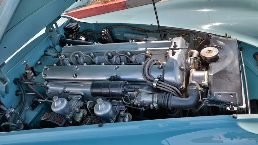 This is an SE (special equipment) car, which means the engine produces something closer to 180 hp. SEs might have C-type heads, lightened flywheels, larger SU carburetors, and high-lift camshafts. All SEs had wire wheels – most often painted body color but optionally chrome – and twin tailpipes. This car is said to be matching numbers in factory condition, with changes only to the consumables such as plugs and filters noted. The car has been tuned, the rear brake cylinders are new, and it rides on new wide whitewalls. The standard gearbox is a Moss four-speed, three-synchro manual. Early differentials were fragile; later cars received the Salisbury diff – thankfully, almost indestructible.