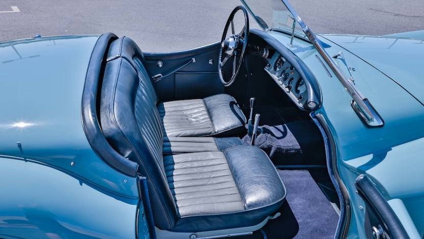 A Jaguar Heritage Trust certificate accompanies the car, memorializing its original colors of Pastel Blue over Blue. The two-toned leather seats show almost no flaws. A full complement of Smith’s gauges is seated in the leather-covered dash. The tool kit? Of course it’s with the car. The trunk is as tidy as it can be, showing off optional fitted luggage.