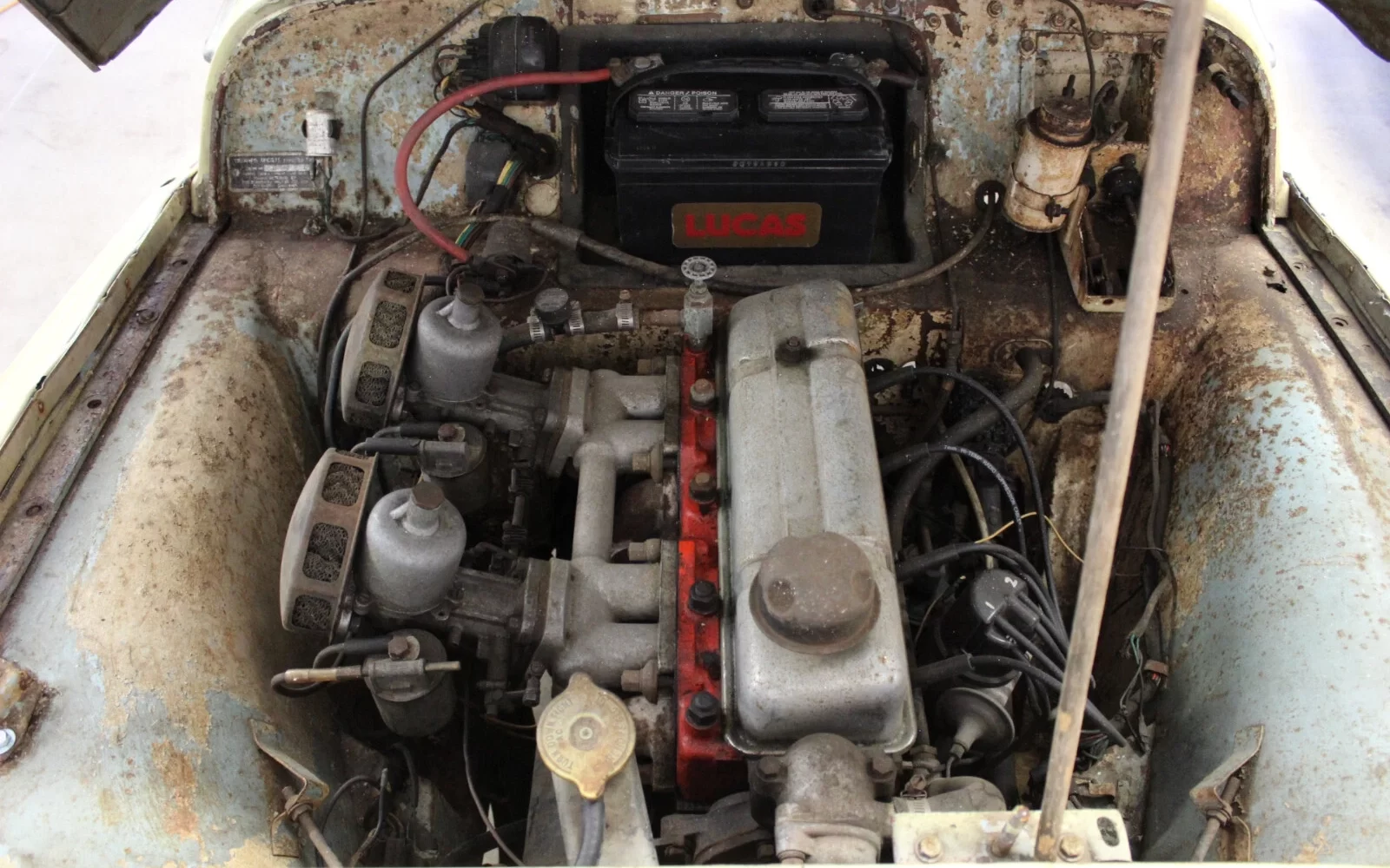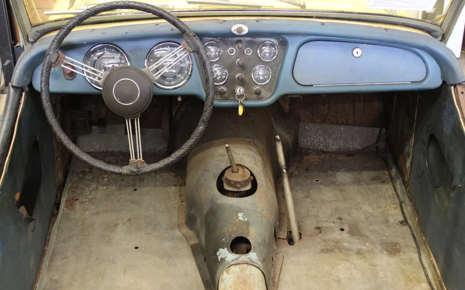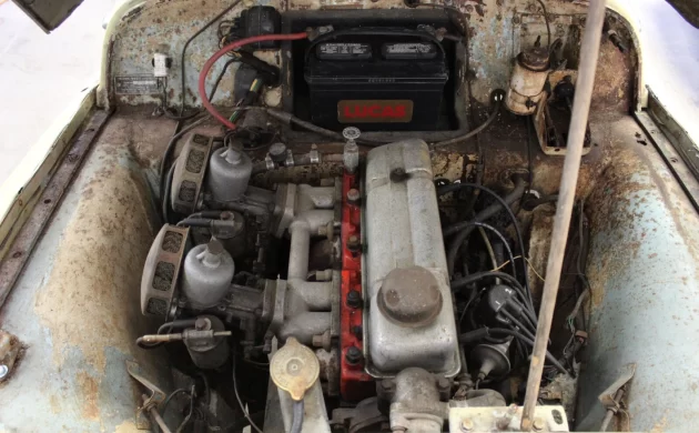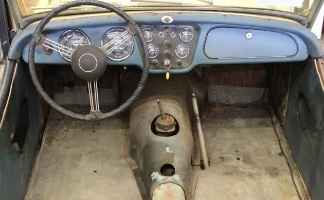Based on the pictures, the interior is complete (the seats have been removed for this shot), and the car will come with new carpet and lower seat upholstery. It’s too bad that the new parts are not the original blue, but at least the sidescreens and top are all there. There’s no doubt that this will be an ambitious project, but at least it’s small.