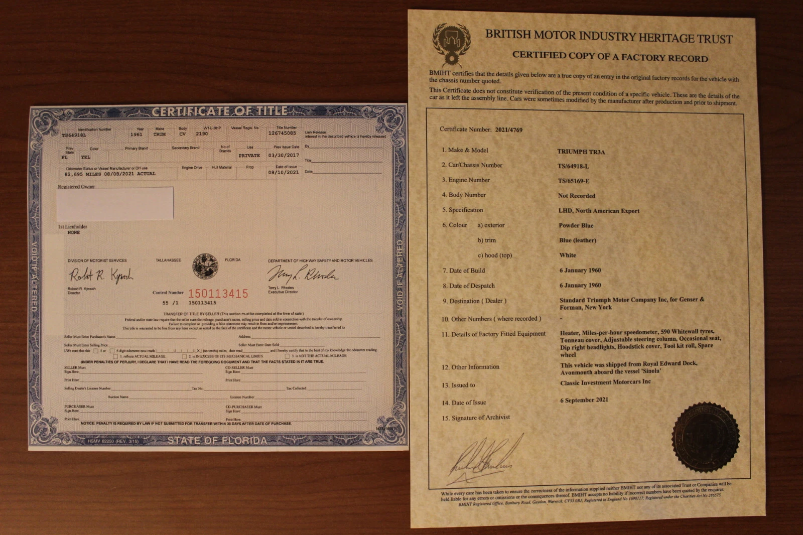 You can see the remnants of the TR’s original color under the hood, where everything mechanical appears to still be in place. The engine does not currently run, but the previous owner told the selling dealer that it “ran when parked.” OK, it ran before the owner disassembled it with the intention of restoring it; unfortunately, his health got in the way and the car sat. The engine still turns, however, and if there’s a chance of getting something to run, it might be one of these tough 1991cc four cylinders. Triumphs were well-known for being powerful (for a small British sports car) and efficient; they were rated at 100 horsepower and could easily achieve fuel mileage nearing 30 miles per gallon. The twin SU carburetors are still fascinating in their simplicity, and parts are readily available. The seller says that the 82,695 miles on the odometer are accurate, according to the title.