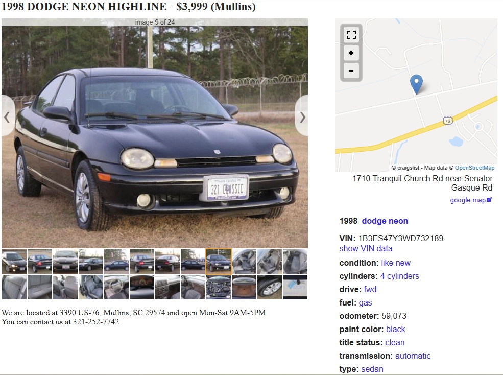 There were three engines available in the first-generation Neon, and this 1998 Dodge Neon Highline has the “hottest” one. 150 horsepower isn’t exactly hot for 2026, but in 1998, in a 2,500-pound car, it was at least warm for ’98. This one is posted here on craigslist in Mullins, South Carolina, and the seller is asking $3,999. Here is the original listing, and thanks to Rocco B. for the tip!