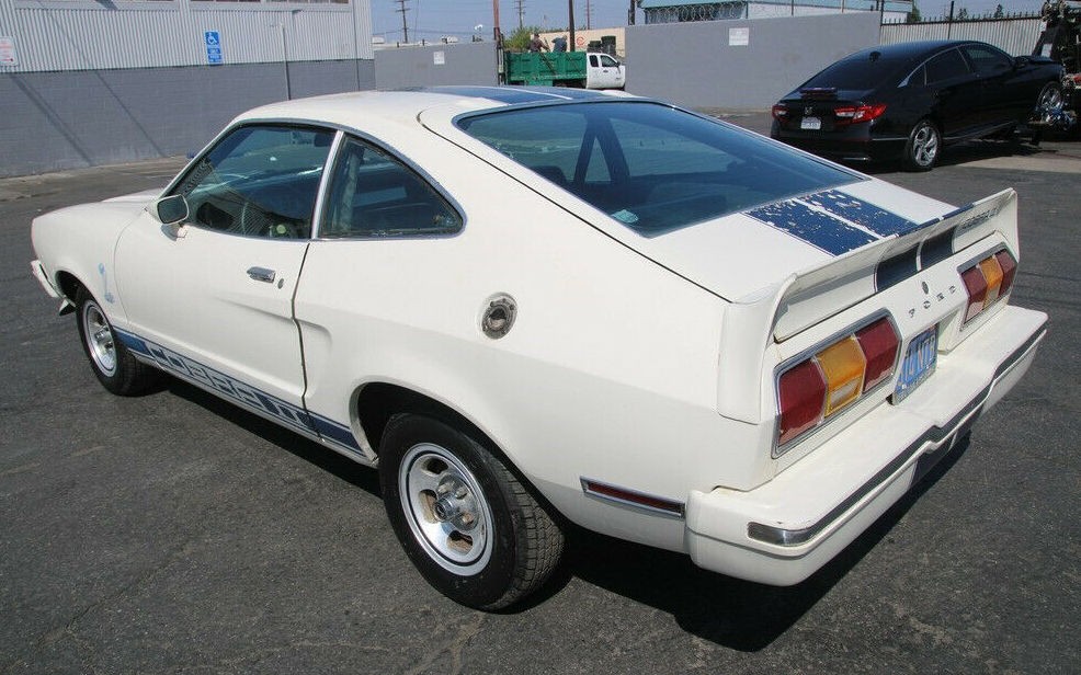 The body looks good from a distance but is said to have scratches and dings. Some extra parts, including the window louvers, are included with the sale. The blue decals appear to be damaged or flaking off, especially on the trunk. The Mustang II is said to run and drive but needs maintenance including carburetor work and new engine mounts. This would be an easy project to fix up and enjoy, if the Mustang II is your cup of tea.