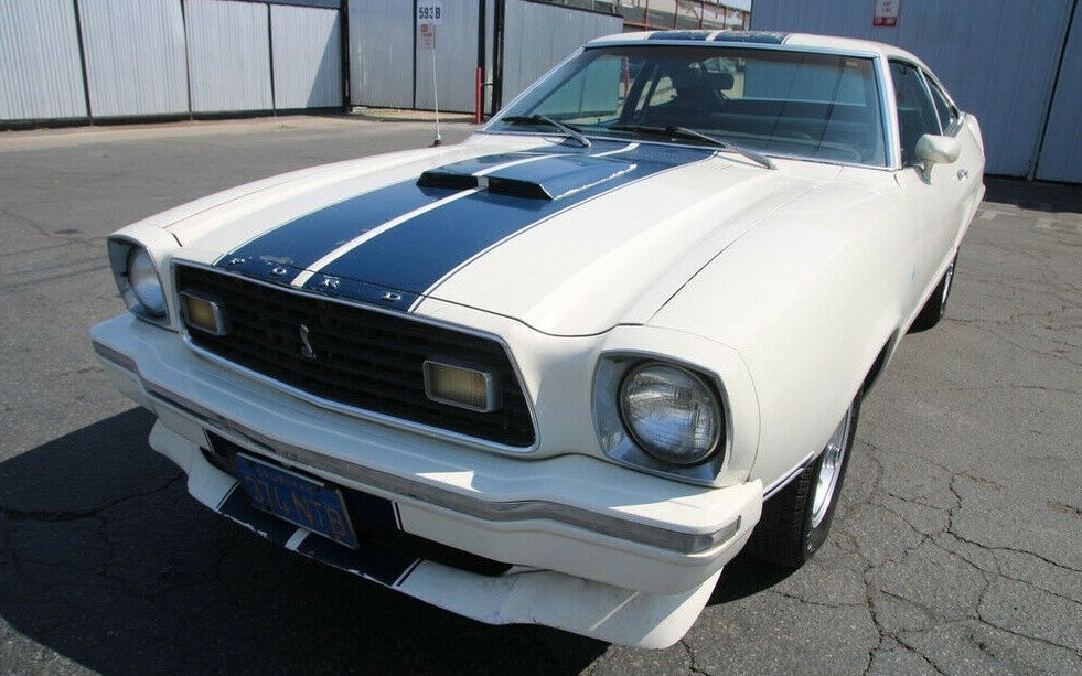 The Mustang II is equipped with a 2.8 liter V6 engine and floor shifted automatic transmission. The Cobra II appearance package was new in 1976 and included a blacked out grille, fake hood scoop, spoilers, side window louvers, racing stripes and Cobra II decals. The Cobra II package could be ordered with any engine. Ford offered the economical 2.3 liter inline 4 cylinder engine that comprised 140 cubic inches, the 2.8 liter V6 that had 171 cubic engines and the aforementioned 5.0 liter V8 that was 302 cubic inches.