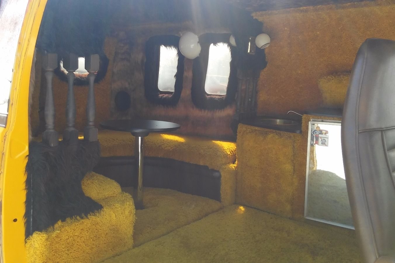 As amazing as the exterior is, the interior is maybe a hundred times more so. The entire thing is lined in either shag carpet or fur, with bubble mood lighting, tasteful wood accents, and a full banquette at the rear for partying or whatever other shenanigans the mirrored ceiling (I can’t emphasize the mirrored ceiling enough) inspires you to get up to.