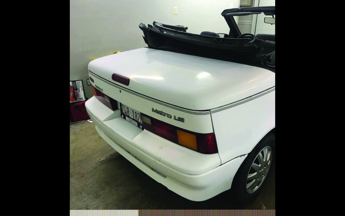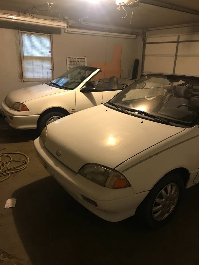 Unlike the somewhat mossy C/D Metros, these two have been garage kept, although that hasn’t entirely saved them from deterioration. The ad makes no distinction between the two cars when listing their flaws, but this picture suggests that the ’92—identifiable by its deeper chin spoiler and, at the rear, its one-piece taillights—is the one that “needs rocker, floor work, convertible top and A/C charged.” Why it has a Jeep badge on the front fender, I don’t know, but that makes it seem like it’s just begging for an off-road adventure.