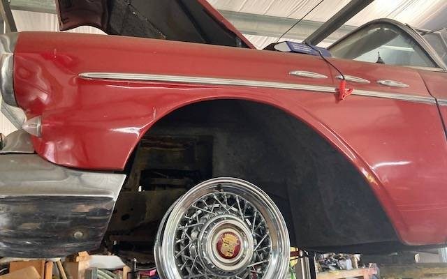 Regarding the exterior, the seller states, “There is some rust in the body because the car is a 65-year-old convertible, but it is not bad. Two rust-free perfect doors come with the car“. There aren’t any comprehensive images, just partials but what can be seen looks pretty sound. There’s no mention of the convertible top and frame and there’s so much stuff piled up on top that it’s not possible to spy a glimpse. Note the wire wheels – is that a Cadillac emblem I see on the center cap?