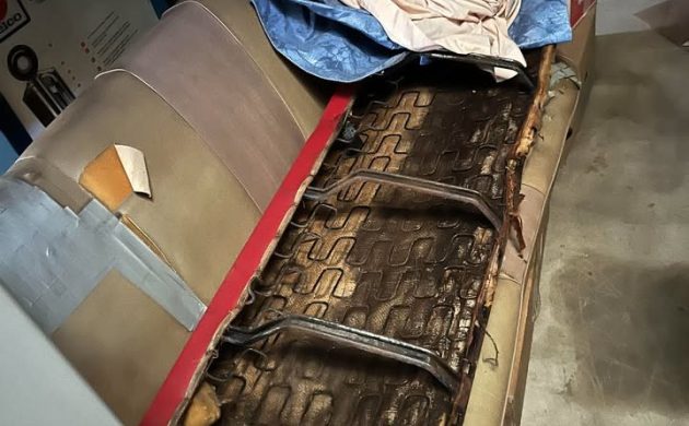 There is this one image of the removed rear seat, and clearly, duct tape has been its friend. The bottom rest appears to be partially upholstered in red, which contrasts with the tan backrest. Likely small matters, but those with an interest may want to request additional, more comprehensive images.