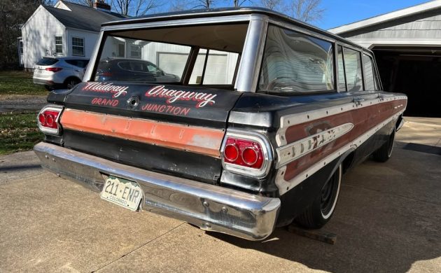 Last week, I covered this 1963 Comet S-22, which was the last of the Comet gen-one editions. This Comet wagon marks the start of the gen-two (’64-’65) variety, which offered three trim levels, Caliente, 404, and 202 series spread across several bodystyles, including two-door hardtops, sedans, convertibles, a four-door sedan, and station wagons. The seller refers to this Villager as “super rare,” and they’re definitely not common, as only 1,980 were assembled. All in all, this example shows pretty well, and the seller refers to it as a “solid Western car“. The DSO (District Sales Office) code is stated to be 51, Denver, Colorado, and that’s certainly western, though I wouldn’t consider Brewester, Ohio, to garner that same descriptive locale. As referened earlier, the dragstrip’s name emblazoned across this wagon’s tailgate was in Grand Junction, Colorado, so that geography may help explain this Mercury’s western description and sound appearance. The finish has obvious problems, but nothing appears to be a significant structural or cosmetic problem.