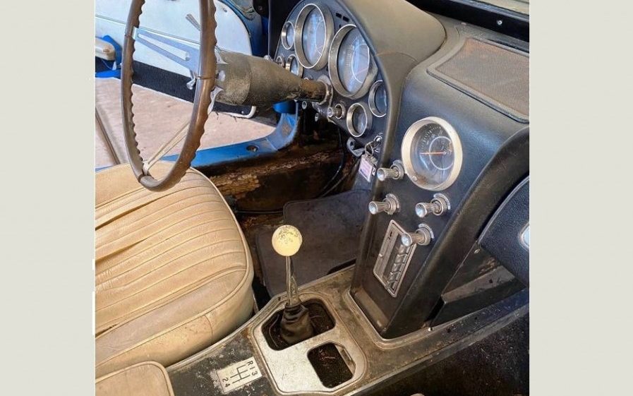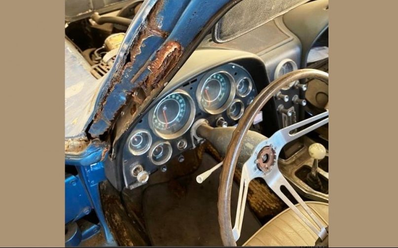 Through dust, cracks, and imperfections, the Sting Ray cockpit beckons, especially that white cue-ball shift knob! No one will suspect that this faded body hides completely refreshed front and rear disc brakes, a new “super deluxe” front suspension and nearly everything in the braking and suspension systems rebuilt or replaced, front and rear. The seller does include a “frame rail repair kit” with the sale, which is either a plus or an omen depending on your perspective.