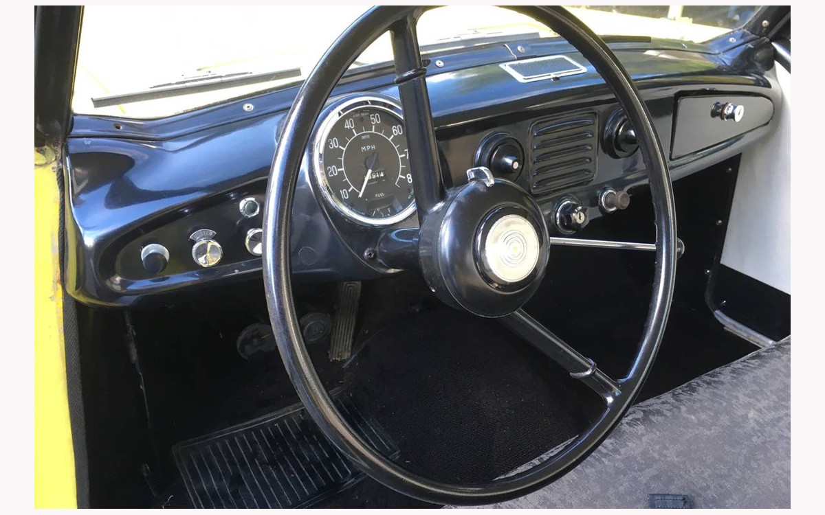 I fitted Midget front disc brakes and a VW Beetle master cylinder to achieve dual circuit brakes. Steering is still stock and does work just fine with the lighter 153″ Chevy (Mercruiser). Stock rear axle with 4.22 gears works great with the overdrive automatic. Got to be careful as I don’t want to twist the rear axle shafts with all that new power. Cruises the freeways easily at 70+mph and we have had it to 90mph with more to go.