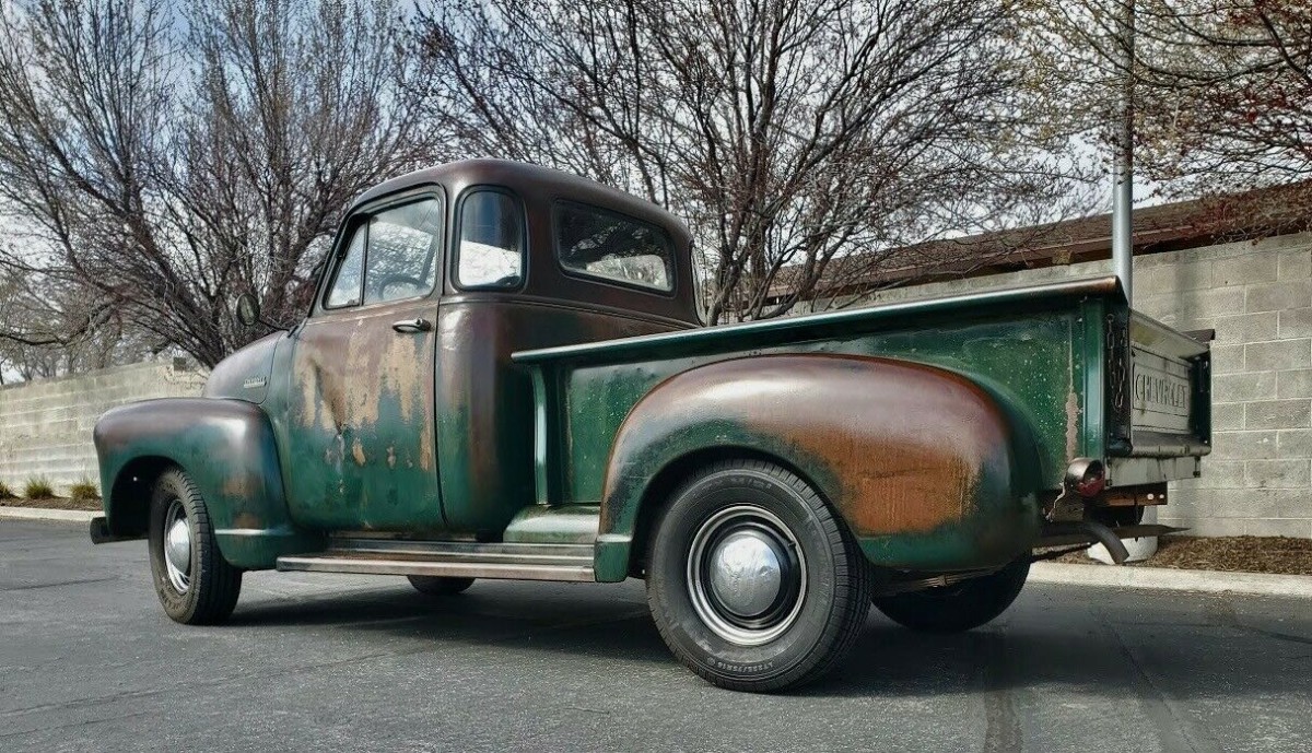 No wonder the hardware store was out of rattle can clear. Well, Could be a ’53, I think it’s a ’52. I read, ’53 had “3100” on the hood, but who knows. Nice little truck, same old thing, it’s a 1953 Chevy. I see oil coming out the gear shift, very common when these were wound out on the highway. Resto-mod central.