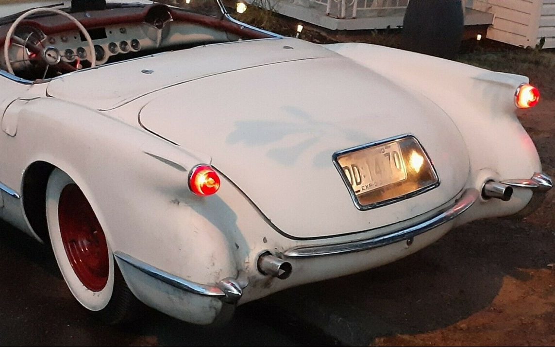 I owned one from 1966 to 1969, paid $600 for it, sold it for $1200, only change was new tires. Wide whites are correct. No mention of side curtains, plexiglass, and mine were so beat up on a 12 year old car, you could barely see through them. They are curved so I could not find anyone to replace them (the internet now does wonders at finding things like this). The tail pipes LOOK like they go through the rear bumper, but if they do, you will get exhaust pealing up over the trunk lid into the passenger compartment. Chevy made a modification in the run so that the tip is a dummy and the exhaust is directed down at the road from before the tip goes through the bumper area. The 6 had plenty of guts for 1955, as long as you wanted to go in a straight line, it was fun to drive. If you were over 5’10” the top of the windshield was in your line of vision, if the top was up you had to sort of hunch over to fit if you were 6′ 1″ like me. The fiberglass was prone to crazing, but some bondo and sanding could make it look good again. Now the question is, is this one the one I had? If there is a dent in the X of the X frame, and the spare wheel cover does not have a “spinner”, it is. It was really not practical even in 1966, you could not park it in the city or the rare parts – wheel covers, headlight screens, side curtains, rear plate cover, or, the whole car, would be stolen. It did not want to go around corners on dry pavement, let alone snow where it was useless, even with big studded snow tires – yes I drove it in the snow in New England, remember it only cost $600. The kid (18) who sold it to me was drafted and headed for Ft. Dix and scared to death. I had just gotten off active duty and talked to him for a couple of hours about what to expect, and, that guys a lot dumber and in a lot worse shape made it through basic, and what he really needed to worry about was going to Viet Nam, which was just then heating up, and if he could type, which he could, he should try for a clerk job, and maybe stay behind the line of fire. OH, and I sold it so I could pay cash for a ’68 big engine, all heavy duty options, special order Chevelle wagon to pull my girl friend’s two horse trailer, 4 speed standard, economy rear axel, so you only used 1st to get it moving with the trailer, and, in 4th the gas mileage