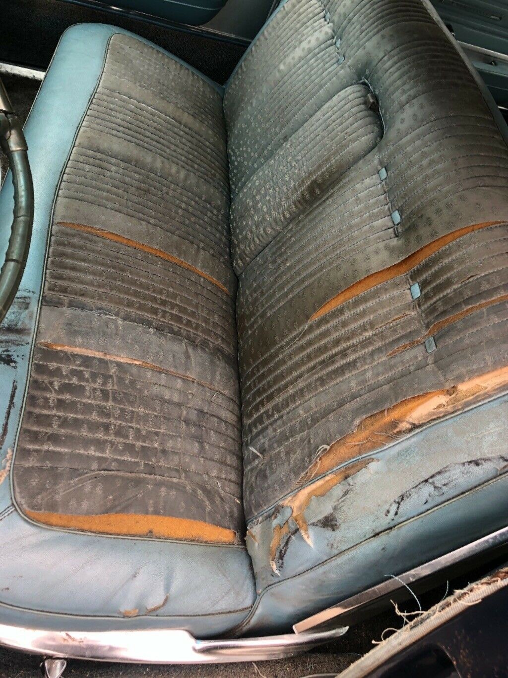 The interior is showing its age in the front seat. It is torn, stained, and most likely the fabric is about rotted. However, the back seat still appears to be in good condition. This car features factory optioned tinted glass, air conditioning, power seats, power brakes, power steering, AM radio, and more. Install new seat foam and seat cover up front and this wouldn’t be a bad place to spend some time.