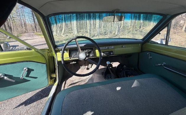 Changes to the appearance of the Valiant were few in 1966, except for the front grille. A new design was coming in 1967 that proved to be the best-selling and longest-lasting (10 years). We gather this 2-door sedan is a basic Valiant, given the lack of bling unless it has been removed. The “majestic dark green” paint does take some getting used to, and we’re doubting it’s the original color of the car. The interior is green (looks blue to me), which would have matched better with white or some other paint job from the factory.