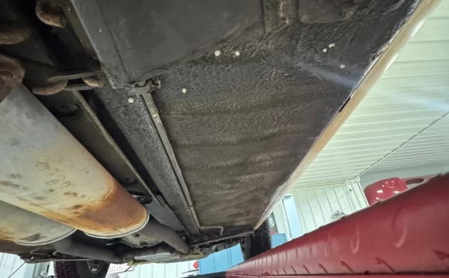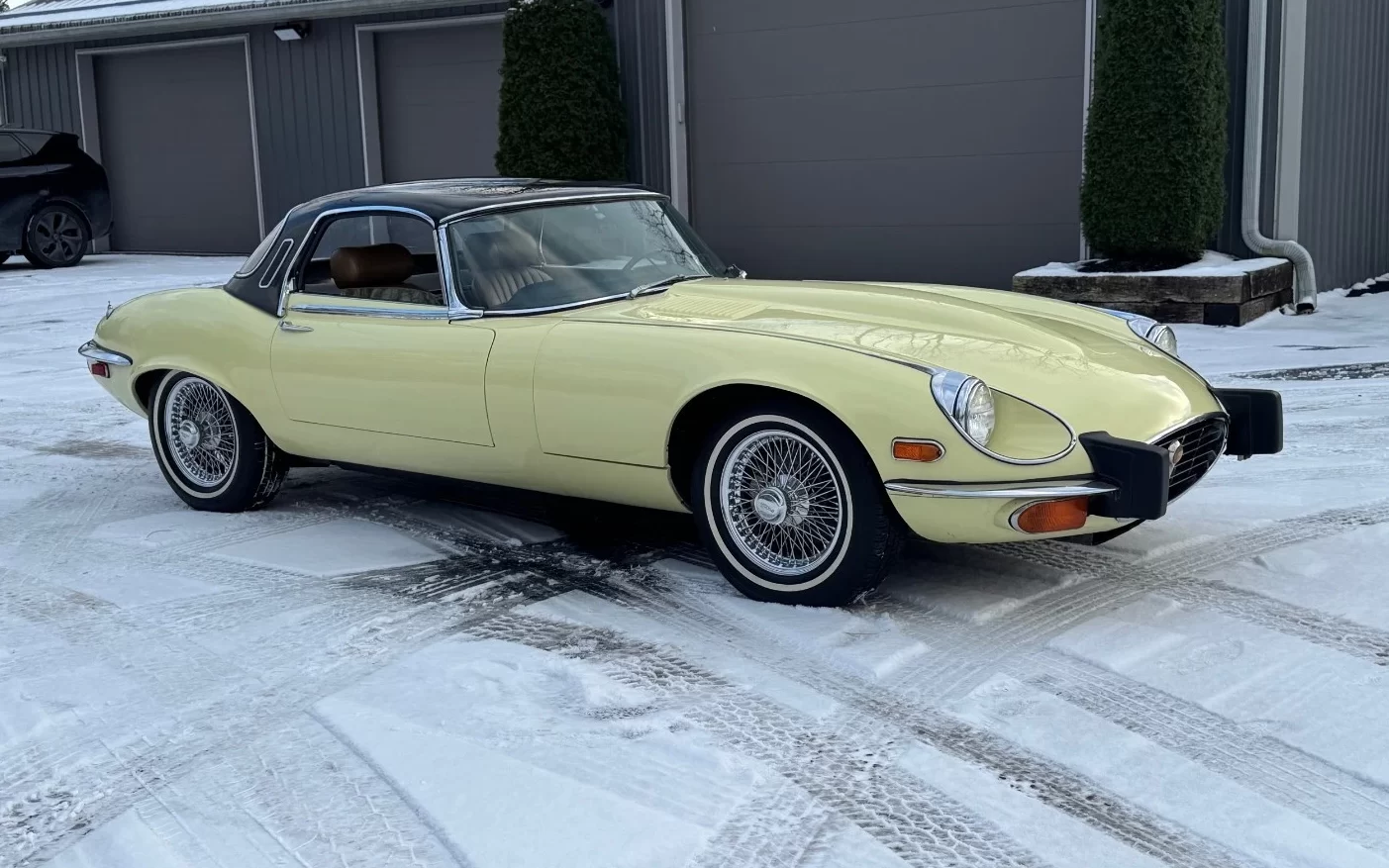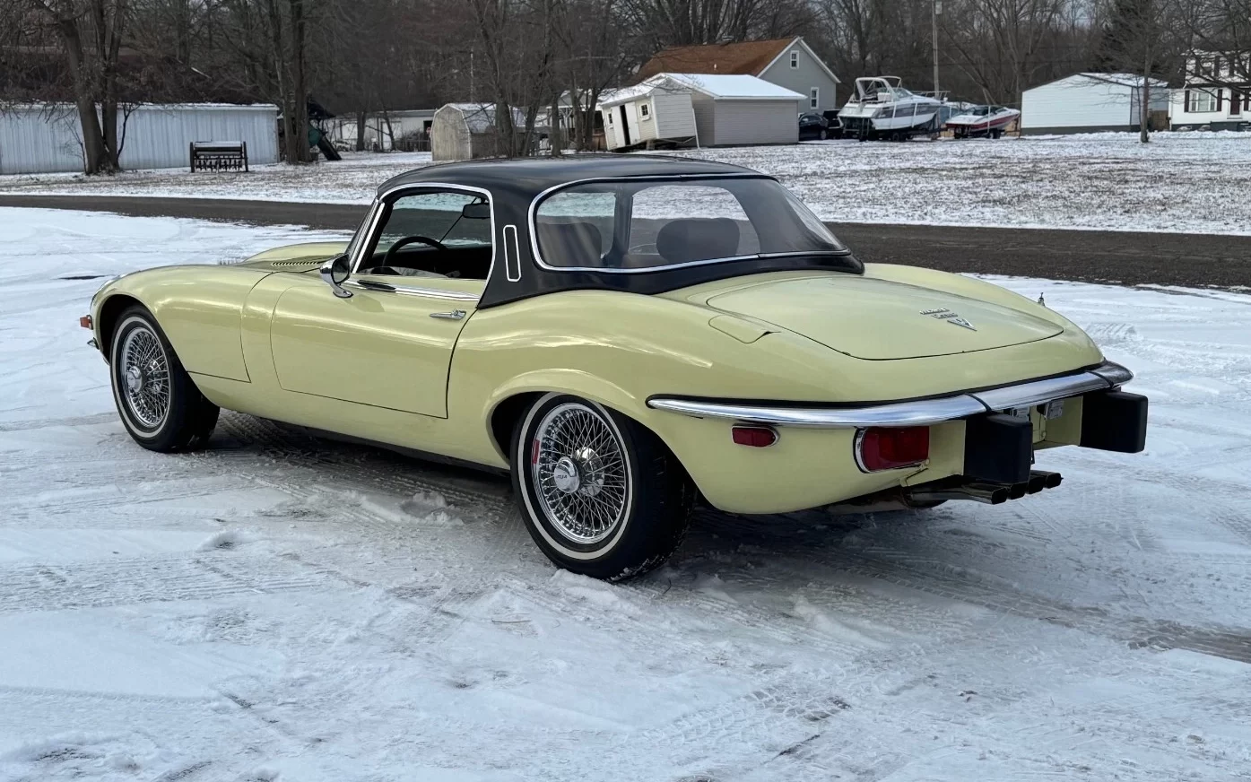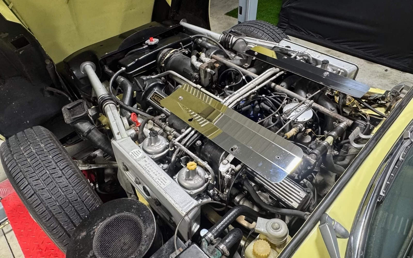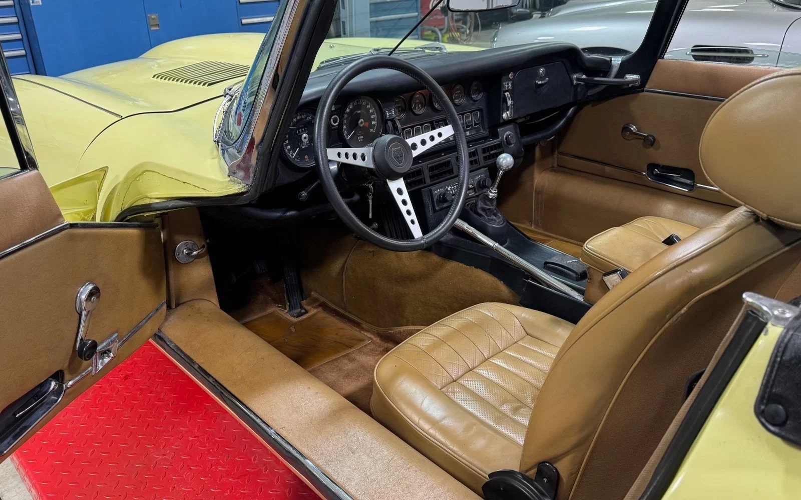 Being a southern car, the E-Type has none of the undercarriage scale and nastiness that plagued cars from more hostile climates. The car has been painted once, and the paint is described as “driver quality.” The black hardtop has a few scratches but is also in presentable shape, and it complements the yellow exterior well. (By the way, is that “Pale Primrose?” It almost looks too yellow.)