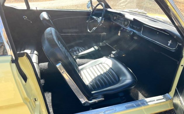 When you visited your busy Ford dealership in 1965, you could choose from a coupe, convertible, or fastback. The coupe was the most popular and came with a 200 cubic inch inline-6 as standard equipment. A 289 CI V8 was optional (though a 260 was available during the 1964 calendar year). We’re told this Mustang now has a 302 engine which means it’s no older than 1968, the year it replaced the 289.