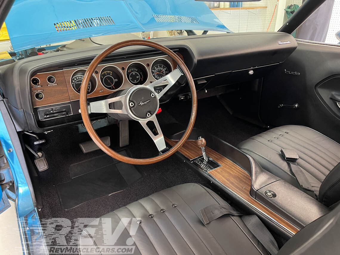 With the entree and main course behind us, it is time to move on to dessert. This ‘Cuda’s interior provides another highlight because finding anything to criticize is challenging. It recently received new door trims, carpet, dash pad, and correct leather and vinyl seatcovers. The seller restored the gauges and applied new faux woodgrain. The console, headliner, and overhead consolette are original, and their condition is excellent. Another interior highlight is the rimblow wheel, with the listing indicating that everything works as it should. The new owner won’t need to spend a dime inside this classic.
