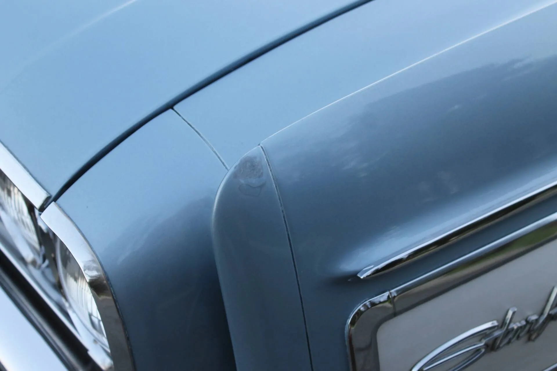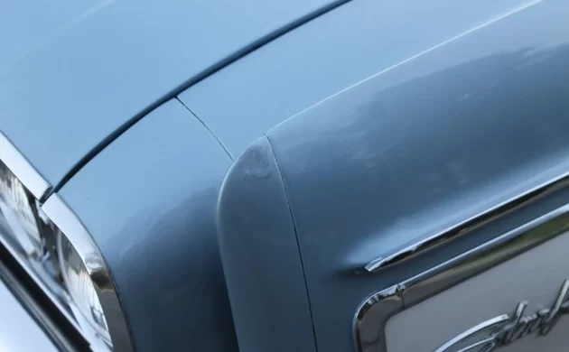The car has been repainted in factory two-tone Provincial White over a very pretty Wedgewood Mist. The advertisement mentions a “blemish” on the left front fender, and this is it. I was personally expecting worse, a good sign regarding the car’s overall condition.