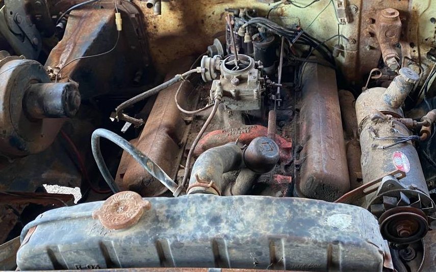 Under the hood is a non-running, 185 gross HP, 283 CI, V8 engine. It’s one of only a zillion made though ’57 was the 283’s inaugural year. Is it seized, or worse? Who knows, it’ll take another trip to KC to figure that one out. Appearance-wise, it looks complete and original, other than the missing air cleaner. The transmission is not referenced but it appears to be a Powerglide, two-speed automatic that’s perched behind the 283.