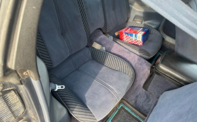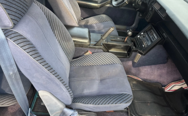 We know nothing of the car’s history except that we’re told it had one previous owner and the odometer reads 61,000 miles. Instead, the seller chooses to use many adjectives (not necessarily accurate) to describe the car. For example, we’re told it’s “a classic coupe with a striking blue exterior color,” while the blue/grey paint is clearly faded and worn. The seller also says it’s “a well-maintained gem,” yet the wheels are chocked, and the tires need air. We’re left to assume it doesn’t run and may need mechanical attention and new paint. On the other hand, the matching interior looks pretty nice.