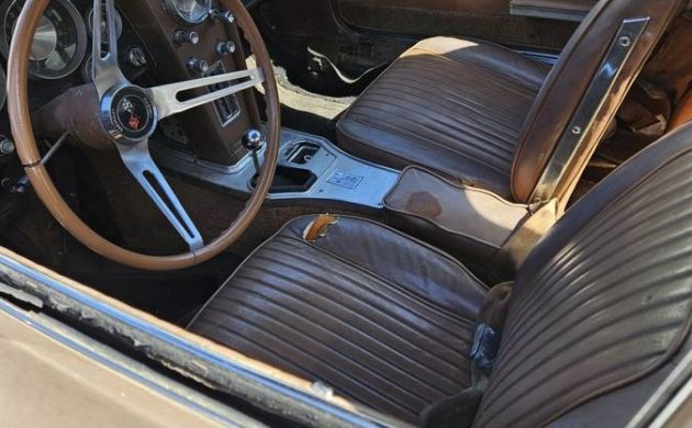 When Chevrolet introduced the C2 Corvette for the 1963 model year, it added a Coupe variant for the first time. It proved an inspired decision, with the Coupe accounting for over 49% of total sales in the first year. The new model also introduced a split rear window into the mix, a decision that divided opinions among owners. Some liked the quirky appearance, while others found the additional strip of fiberglass prone to blocking rearward visibility in some circumstances. It appears that Chevrolet was listening, because that feature disappeared permanently the following year. The history of this one-owner ’63 Coupe is unclear, with the seller describing it as a barn find. Certainly, the tired Saddle Tan paint supports that claim, making a cosmetic restoration appear the most obvious choice moving forward. It will be a major undertaking, because with plenty of checking and other flaws, stripping the body entirely would seem to be the only option. However, the fiberglass looks good, and if the car has spent its life in its current location, frame and birdcage rust may not be an issue. Any cosmetic refresh would involve sending many of the chrome trim pieces to the platers, but the glass looks okay.