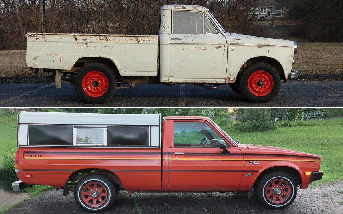I love small trucks, I have one that’s about a foot longer than this one. My 1980 Dodge D-50 Sport pickup is small, or I thought it was before I found out that this Datsun’s 97-inch wheelbase is a foot shorter than the one on my truck. Here’s a composite photo of both of them for a comparison, which is basically meaningless now that I think about it.