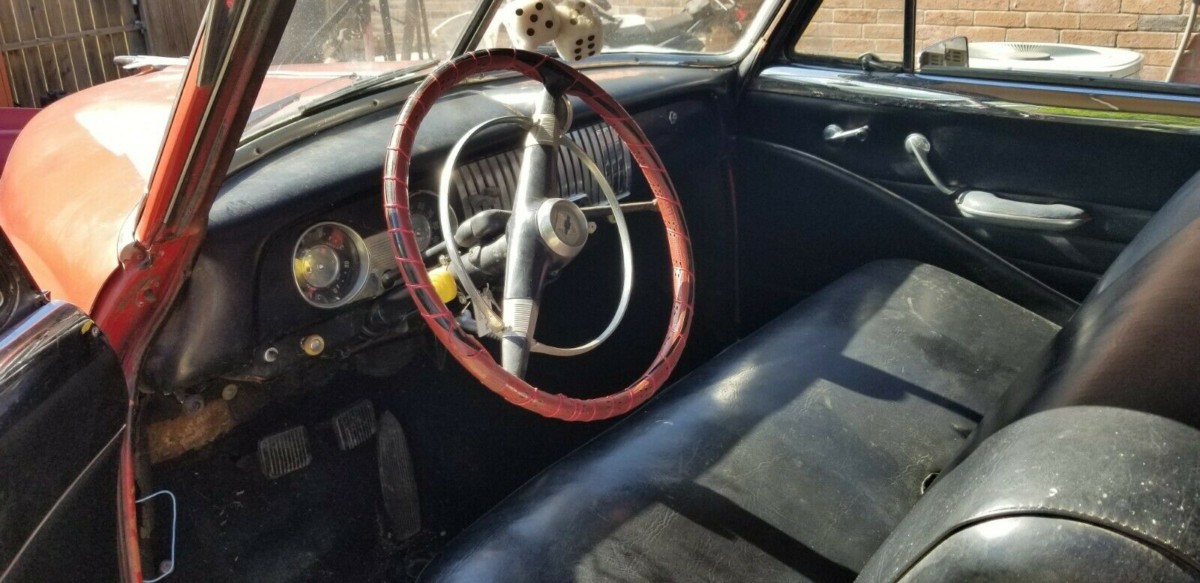 The hood and grille on this car are from a 1951. Dashboard has been painted. Originally the area around the gauges and the glove box door would have been a light gray. The top of the dash and the inside window surrounds came in a few colors. Dk gray, blue, green